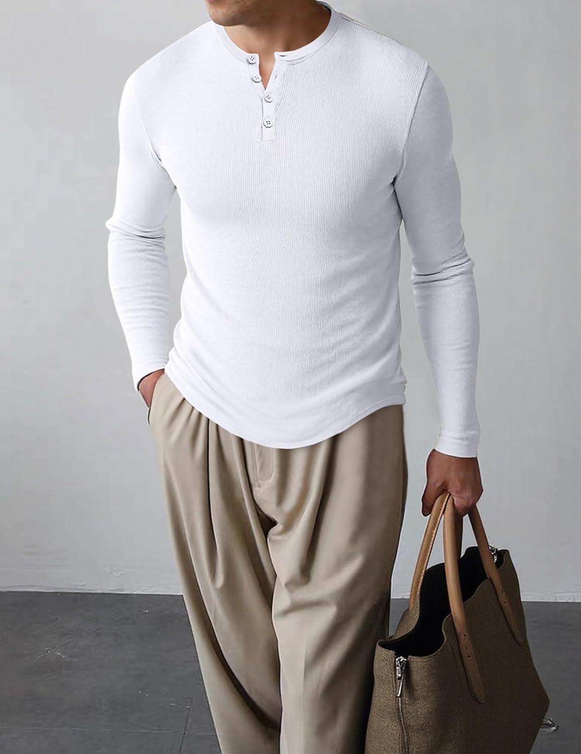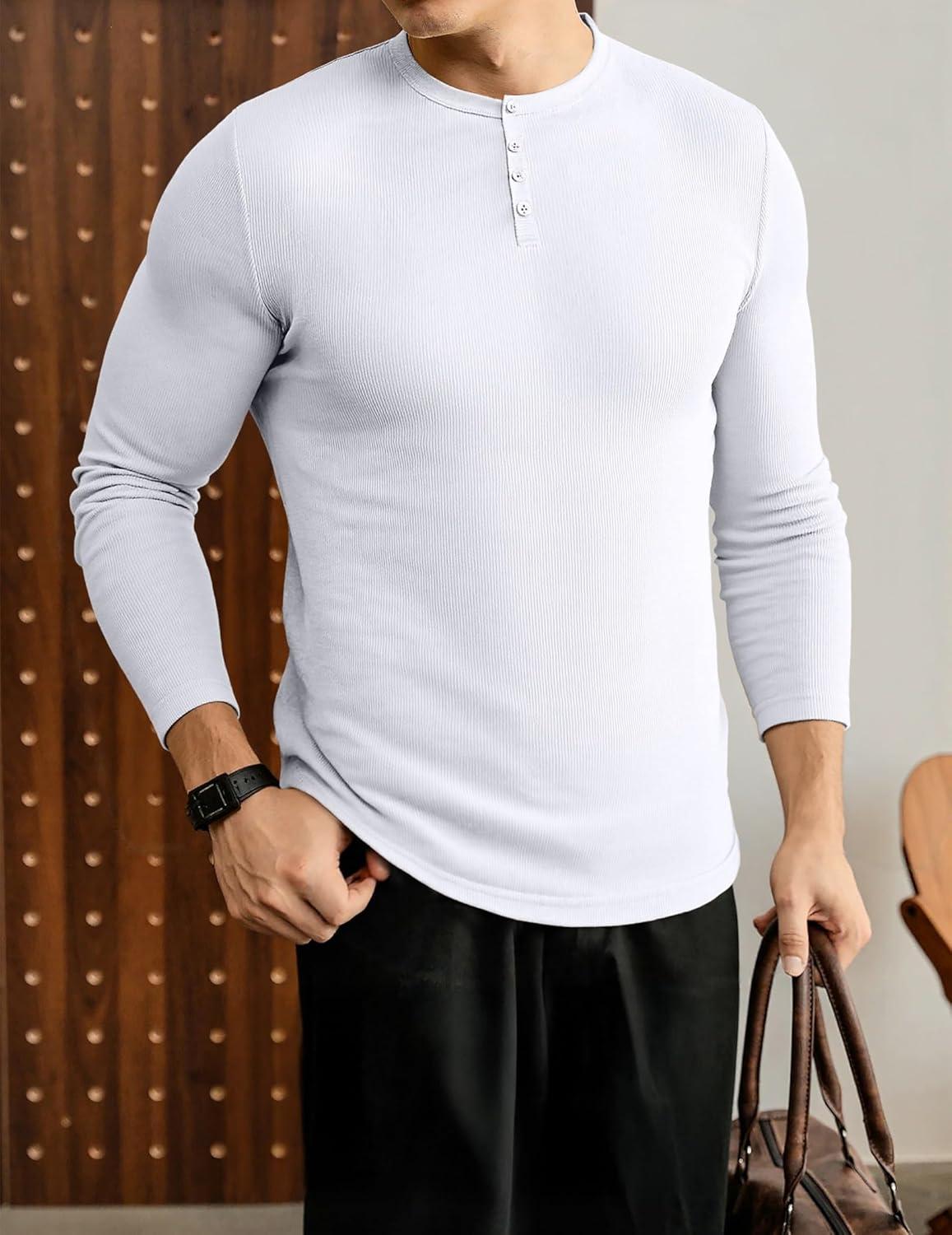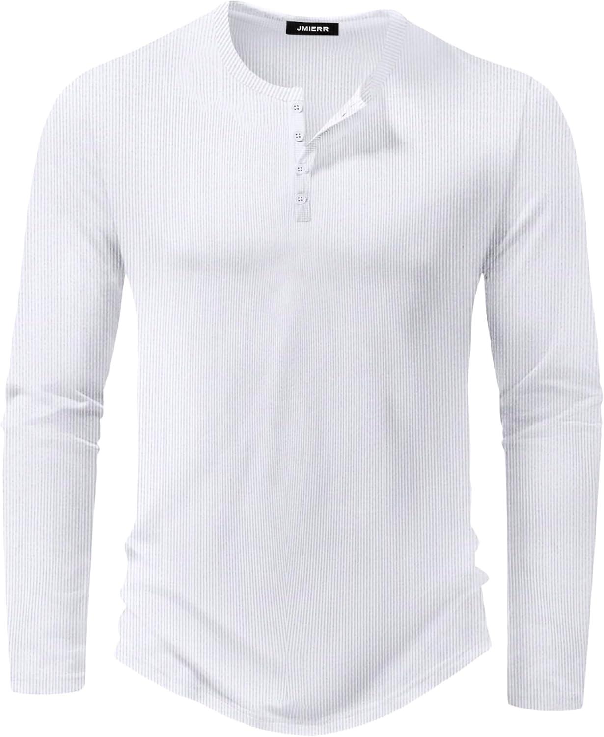 JMIERR Mens 2025 Fall Fashion Casual Henley Shirt Long Sleeve Slim Fitted Shirts Curved Hem for Athletic Gym Workout(0 White)