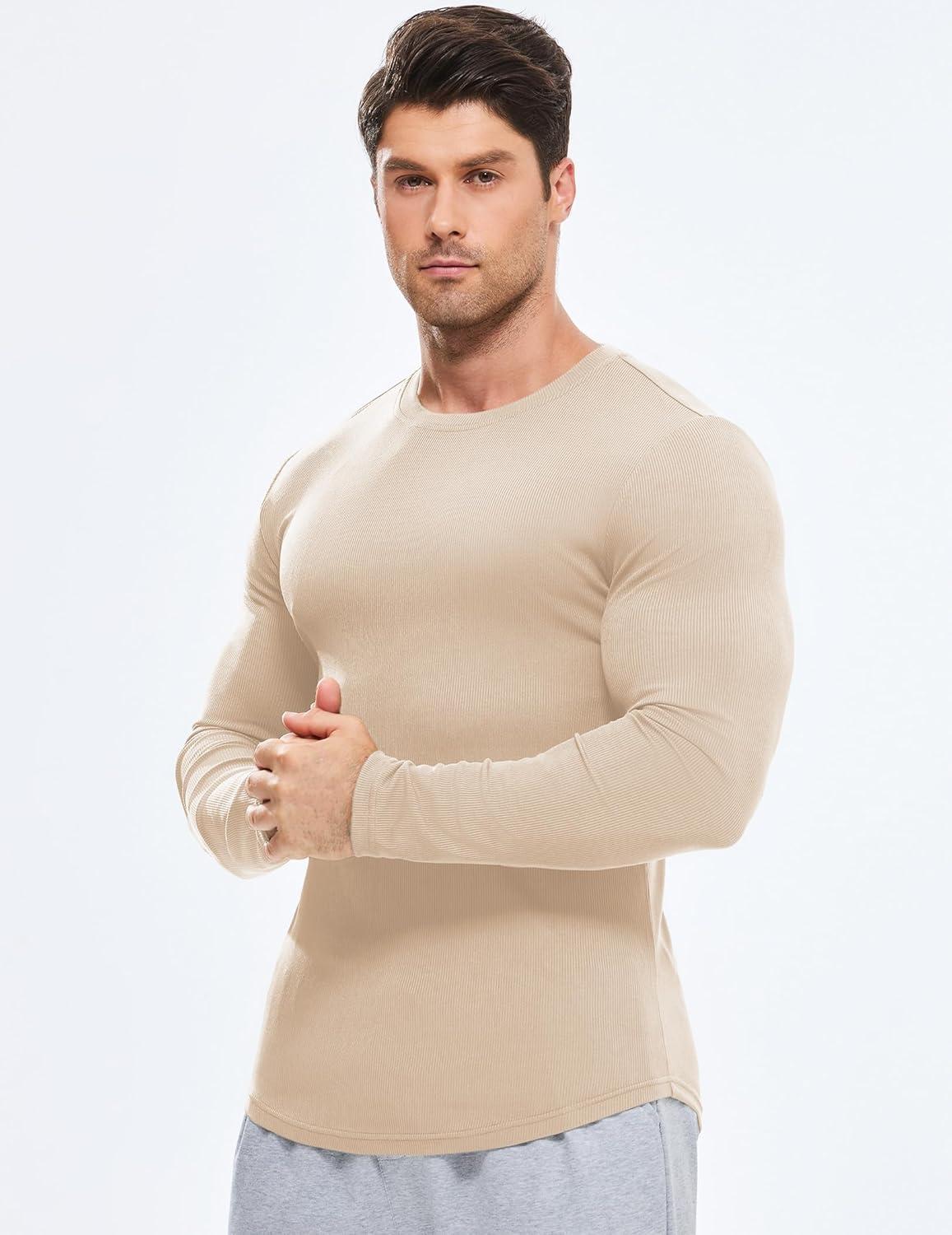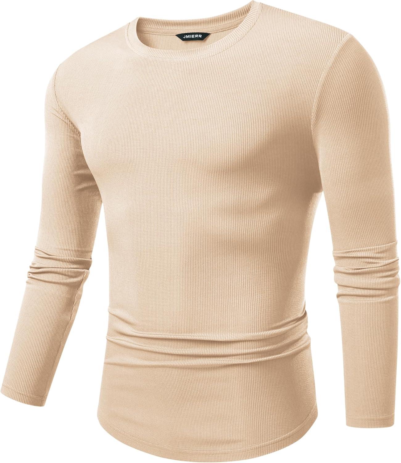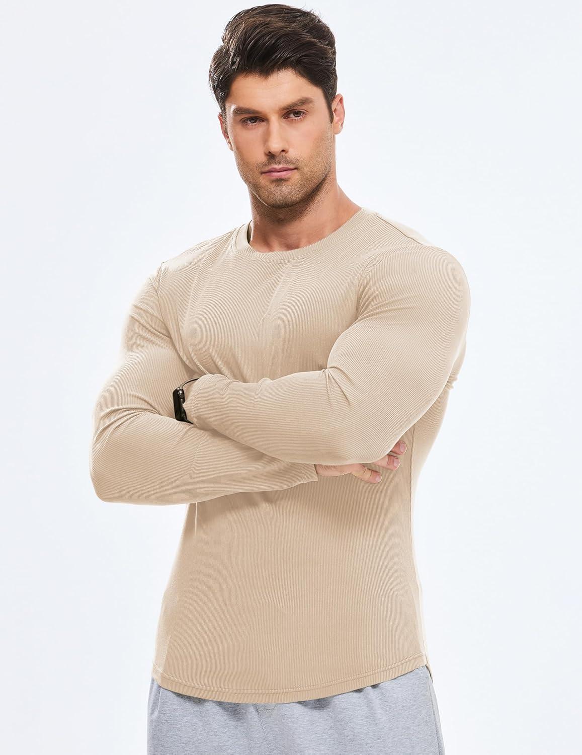 JMIERR Mens Fall Crewneck Shirt Long Sleeve Anti-Wrinkle Casual Muscle T Shirts Longline Ribbed Shirts(05 Beige)