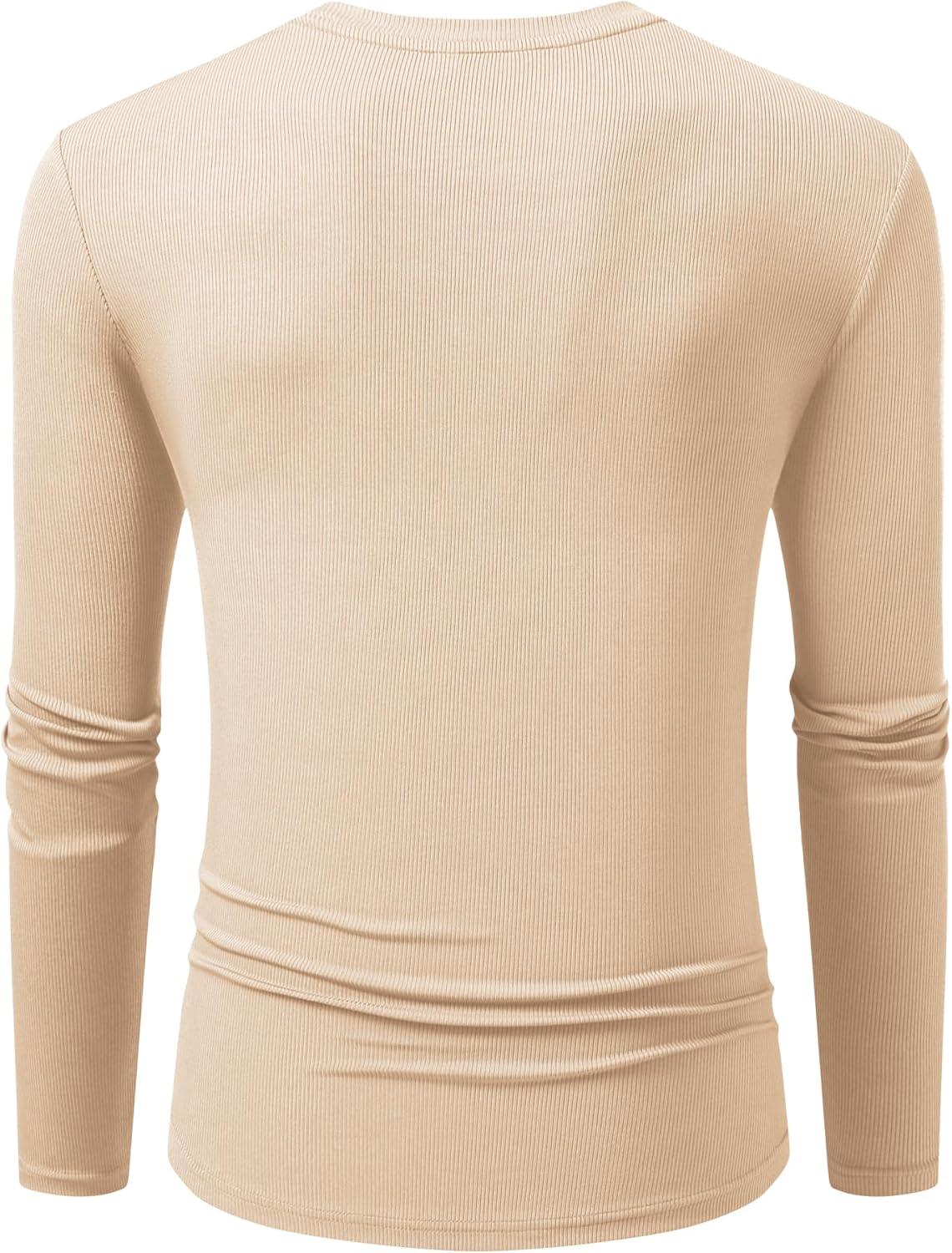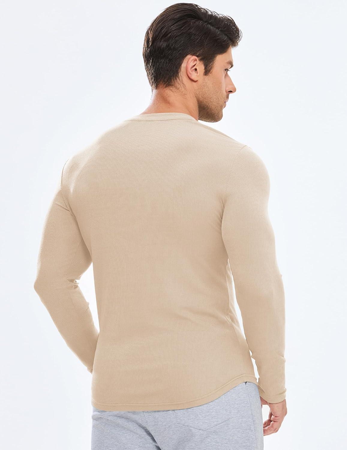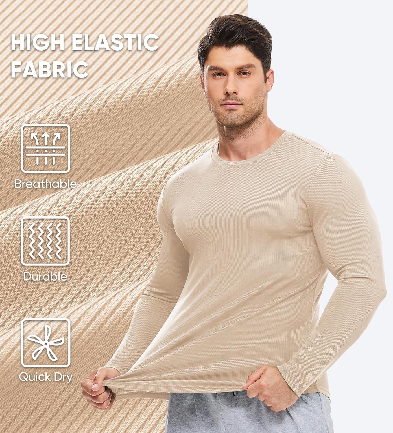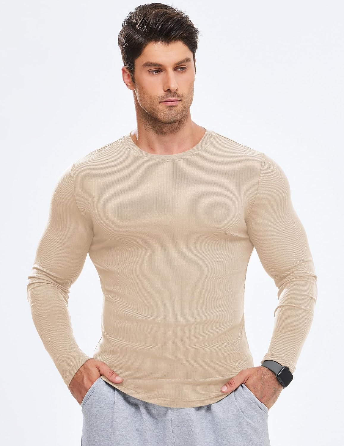 JMIERR Mens Fall Crewneck Shirt Long Sleeve Anti-Wrinkle Casual Muscle T Shirts Longline Ribbed Shirts(05 Beige)