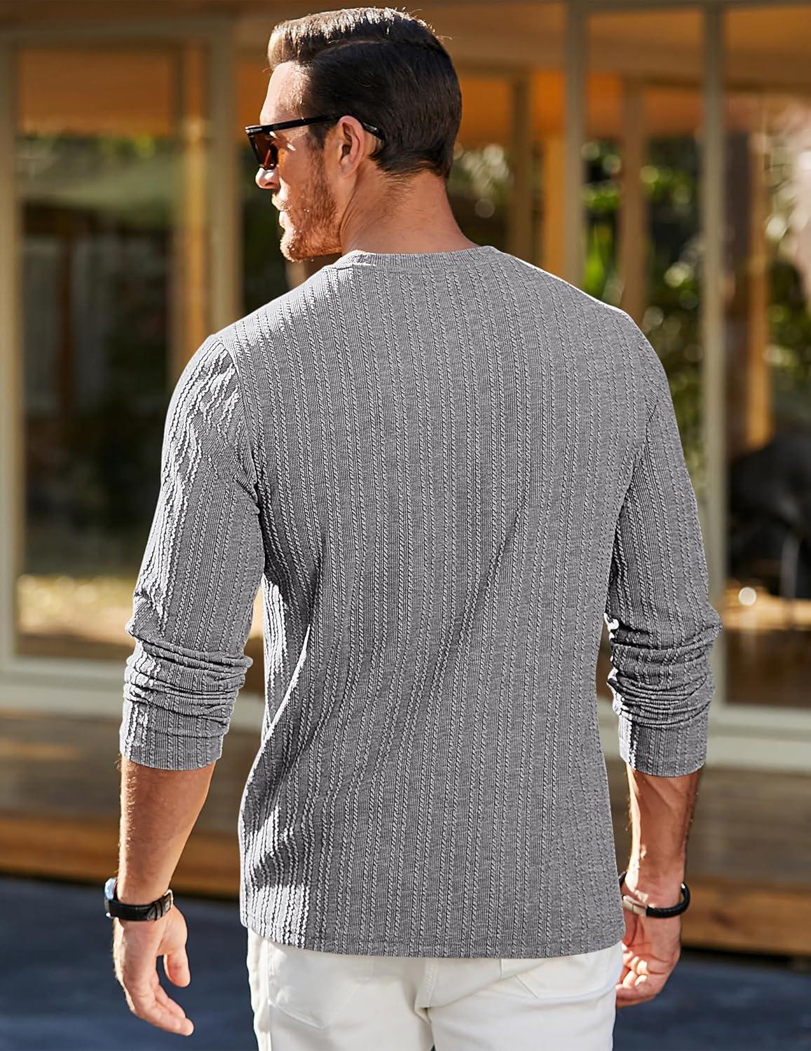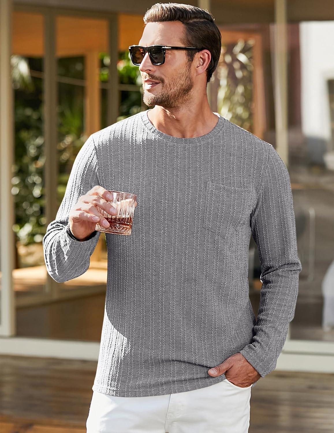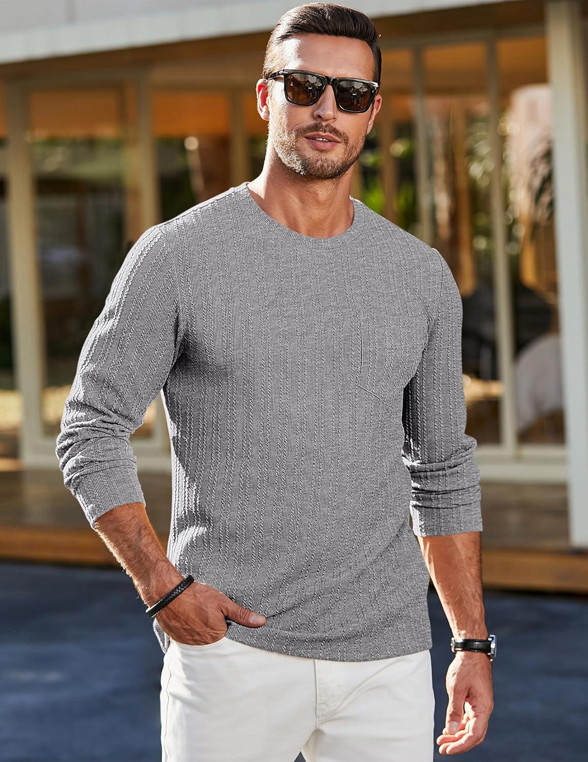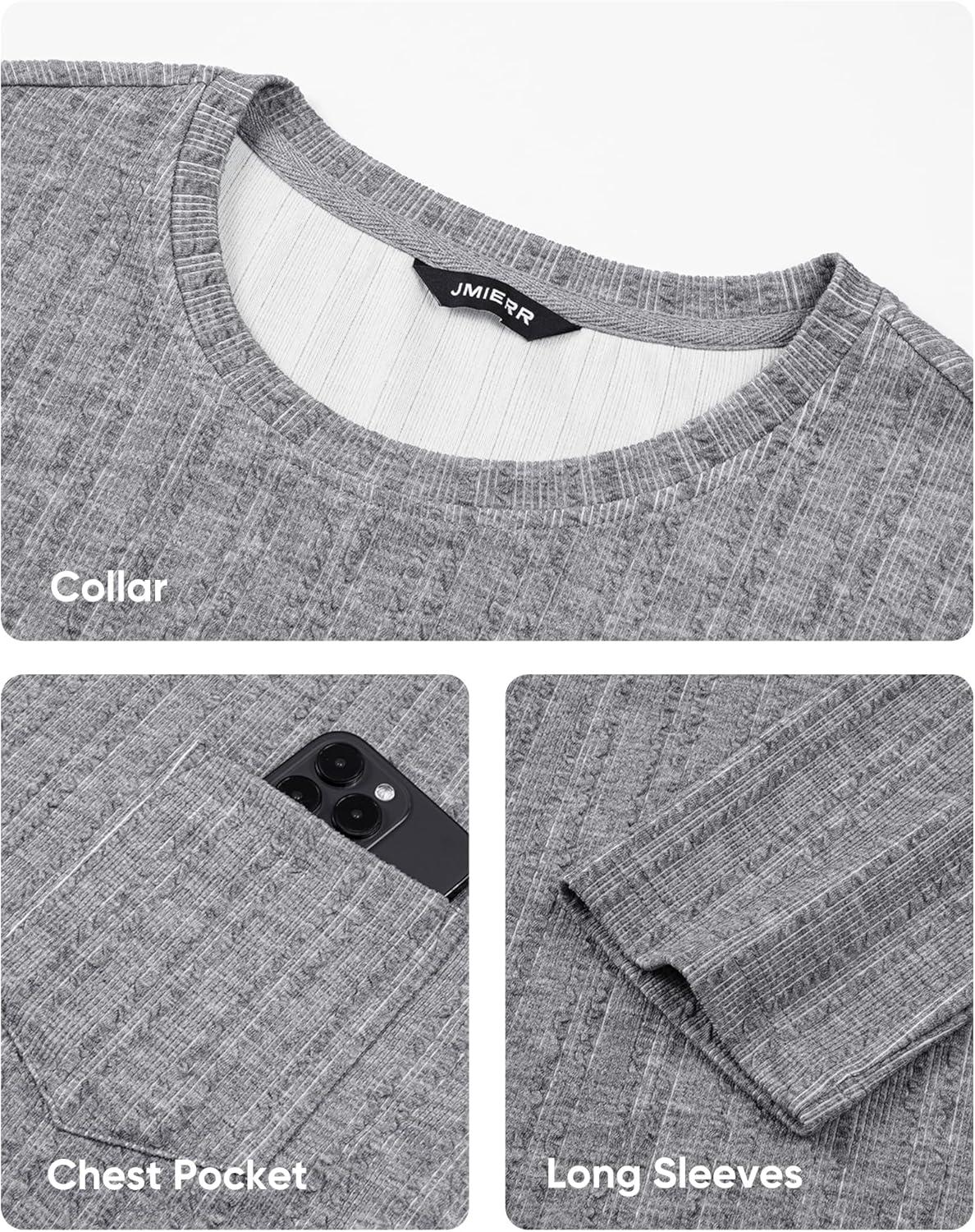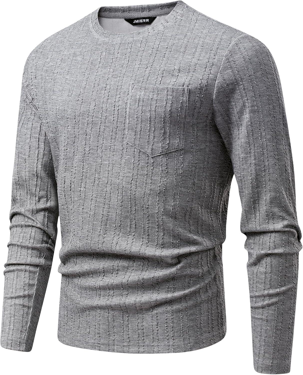 JMIERR Men’s Long Sleeve Shirts Casual Crewneck Pullover T-Shirt Stretch Textured Knit Tee with Pocket(01 Grey)