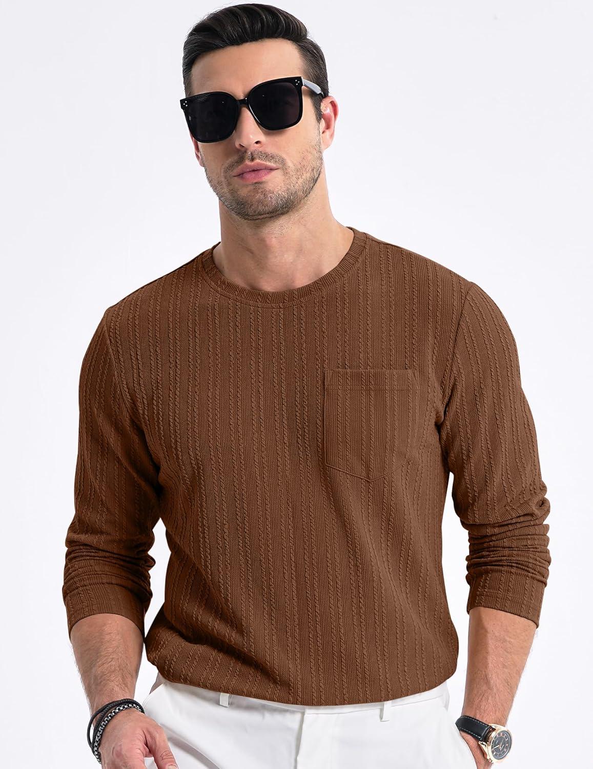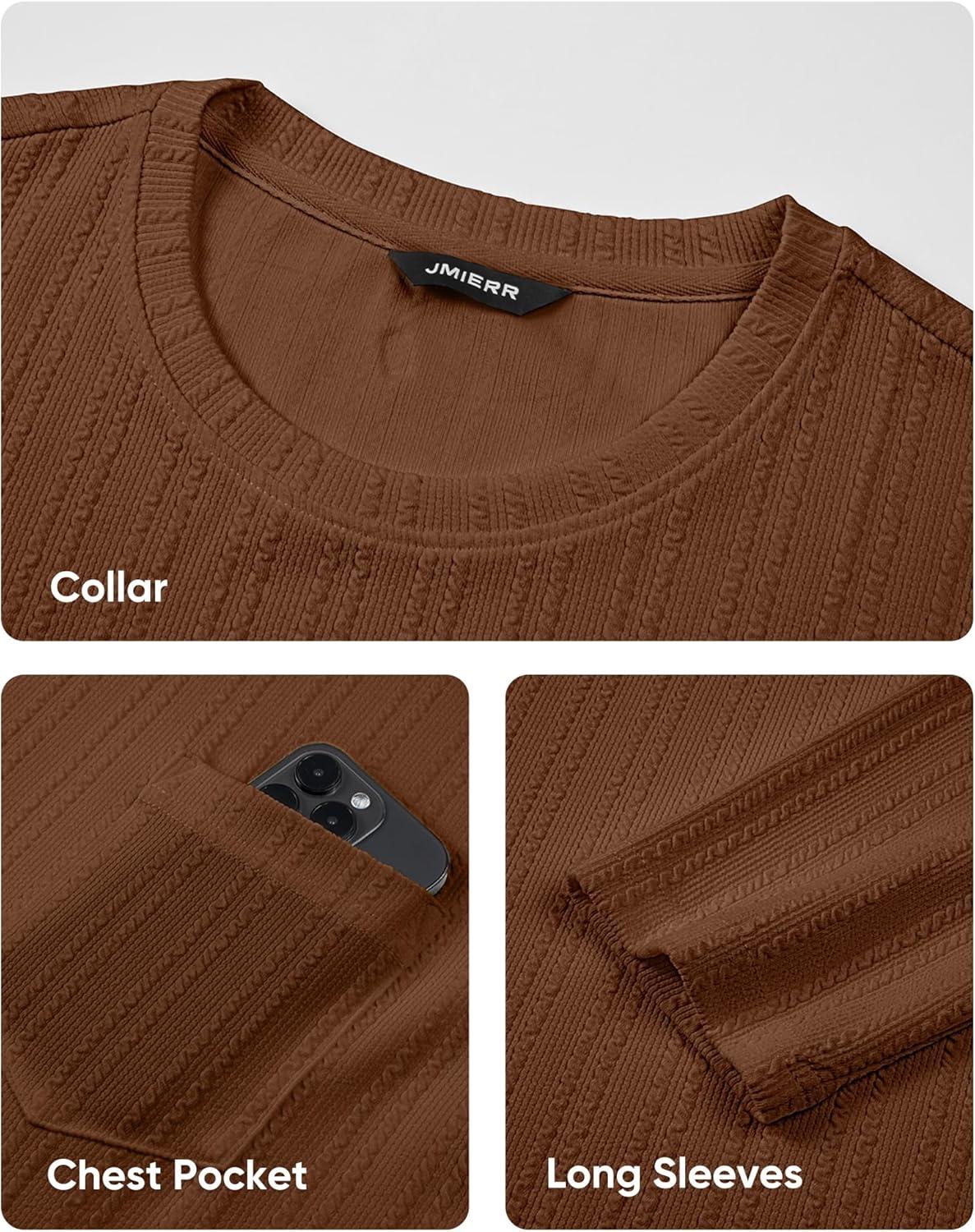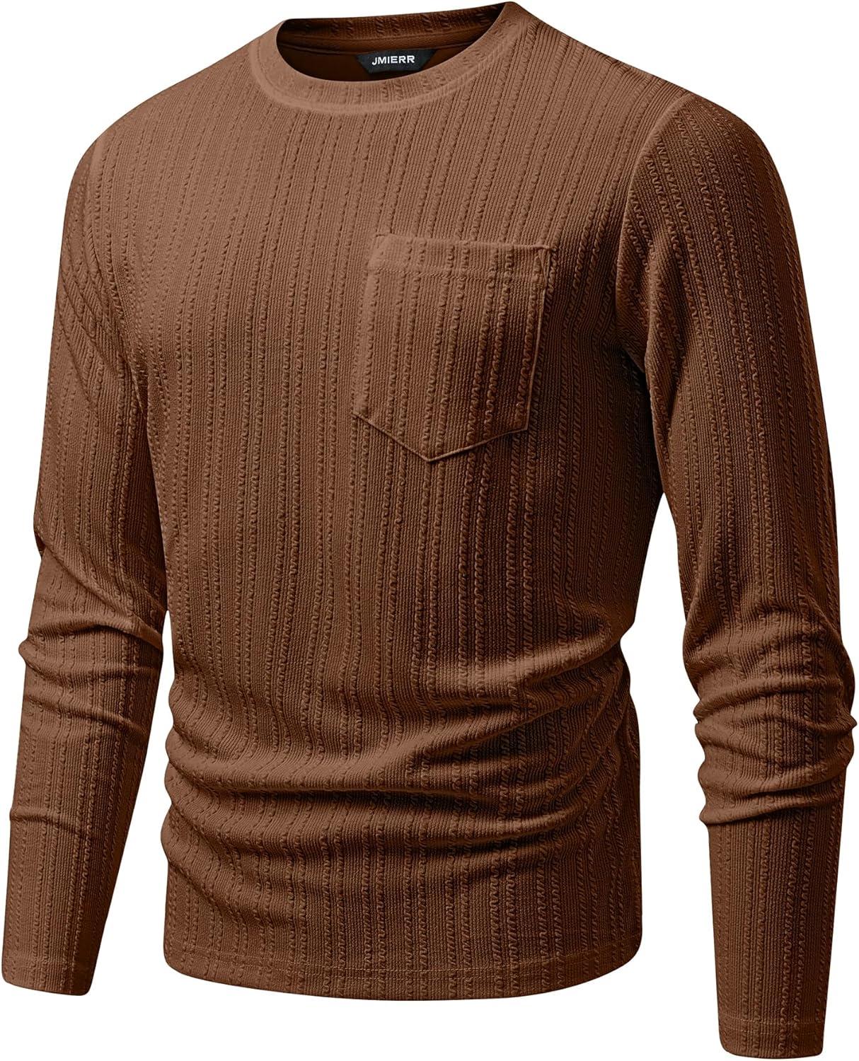 JMIERR Men’s Long Sleeve Shirts Casual Crewneck Pullover T-Shirt Stretch Textured Knit Tee with Pocket(03 Brown)