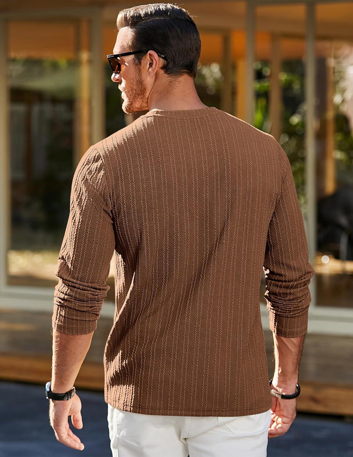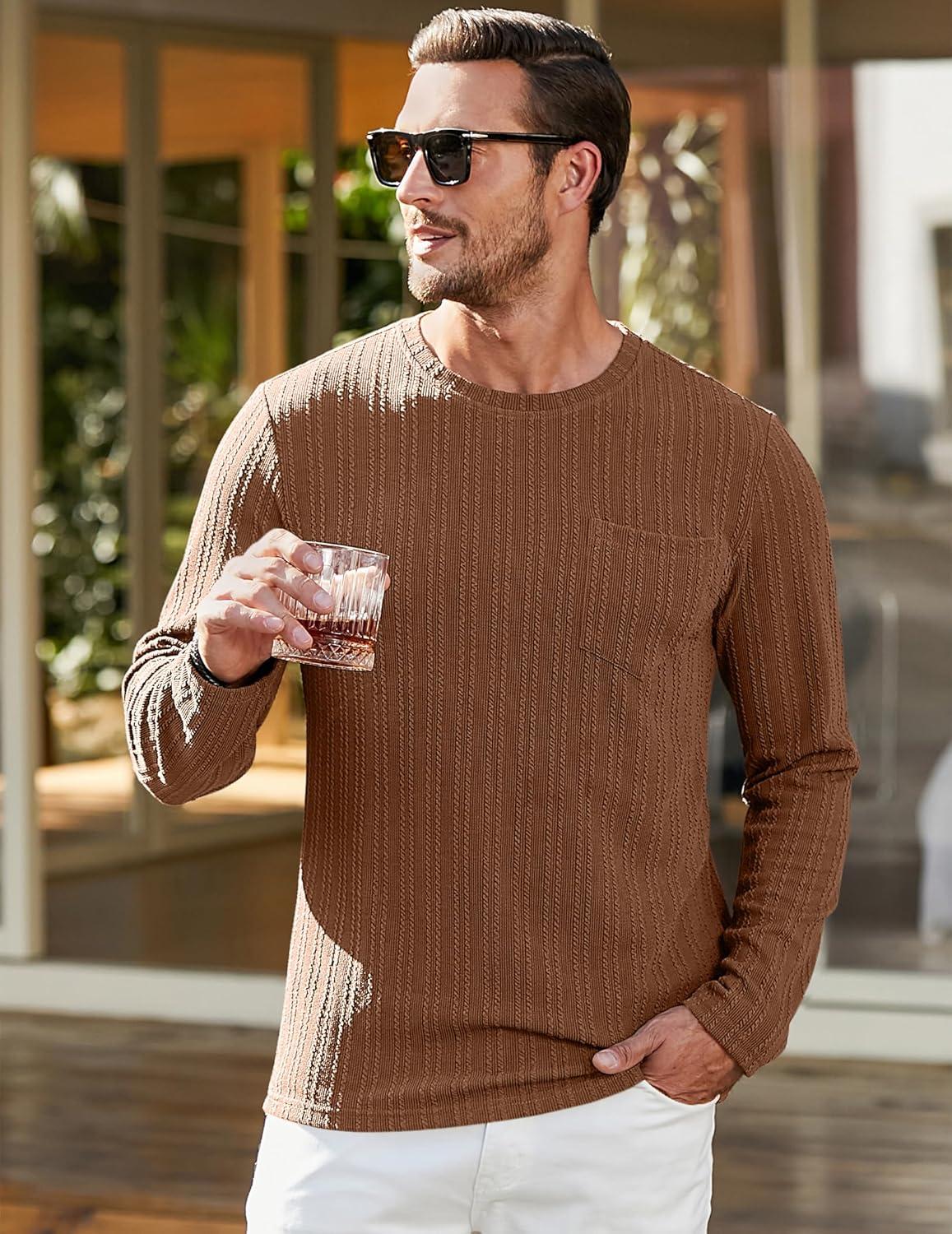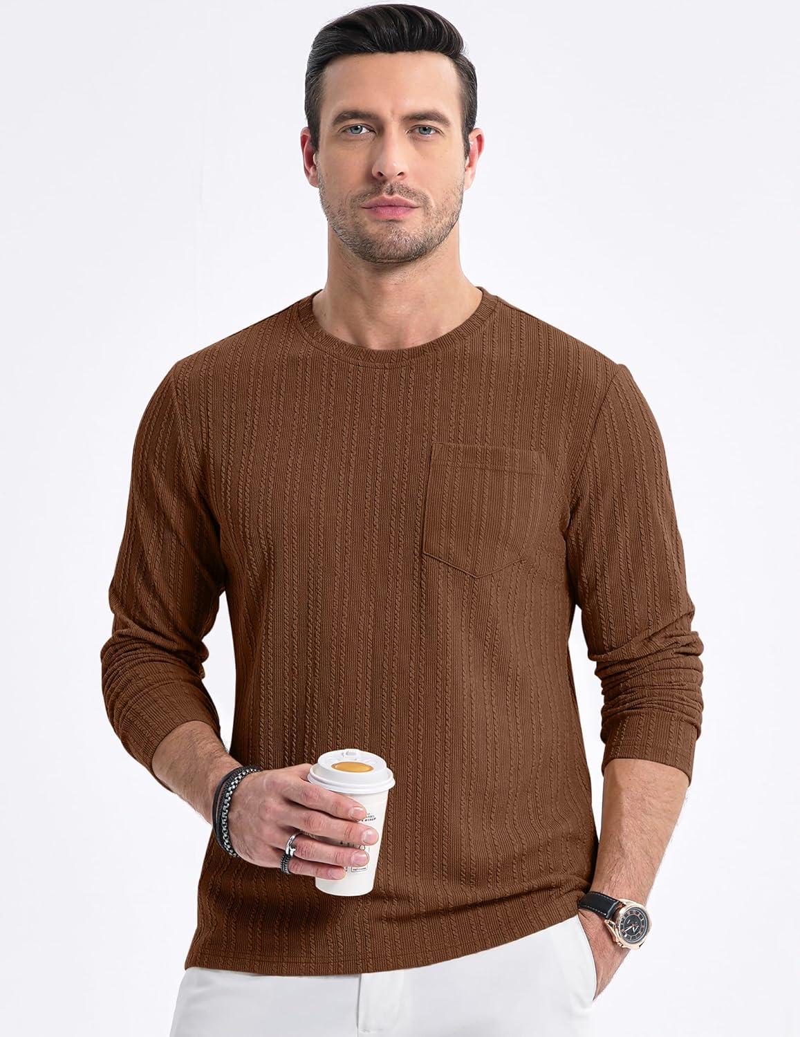 JMIERR Men’s Long Sleeve Shirts Casual Crewneck Pullover T-Shirt Stretch Textured Knit Tee with Pocket(03 Brown)