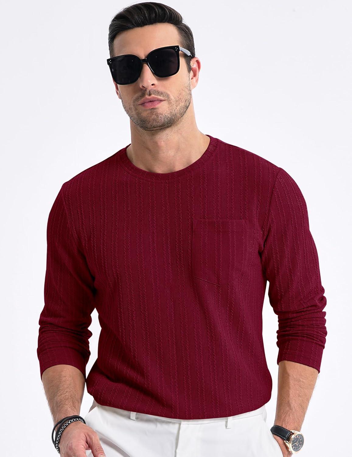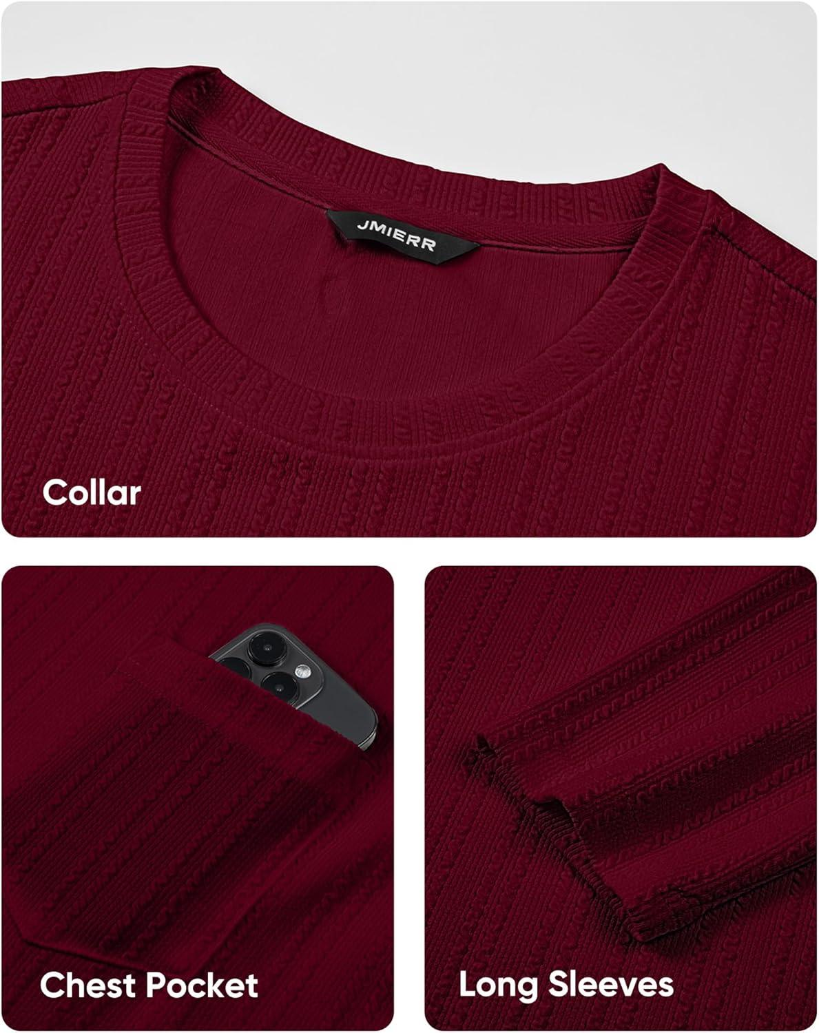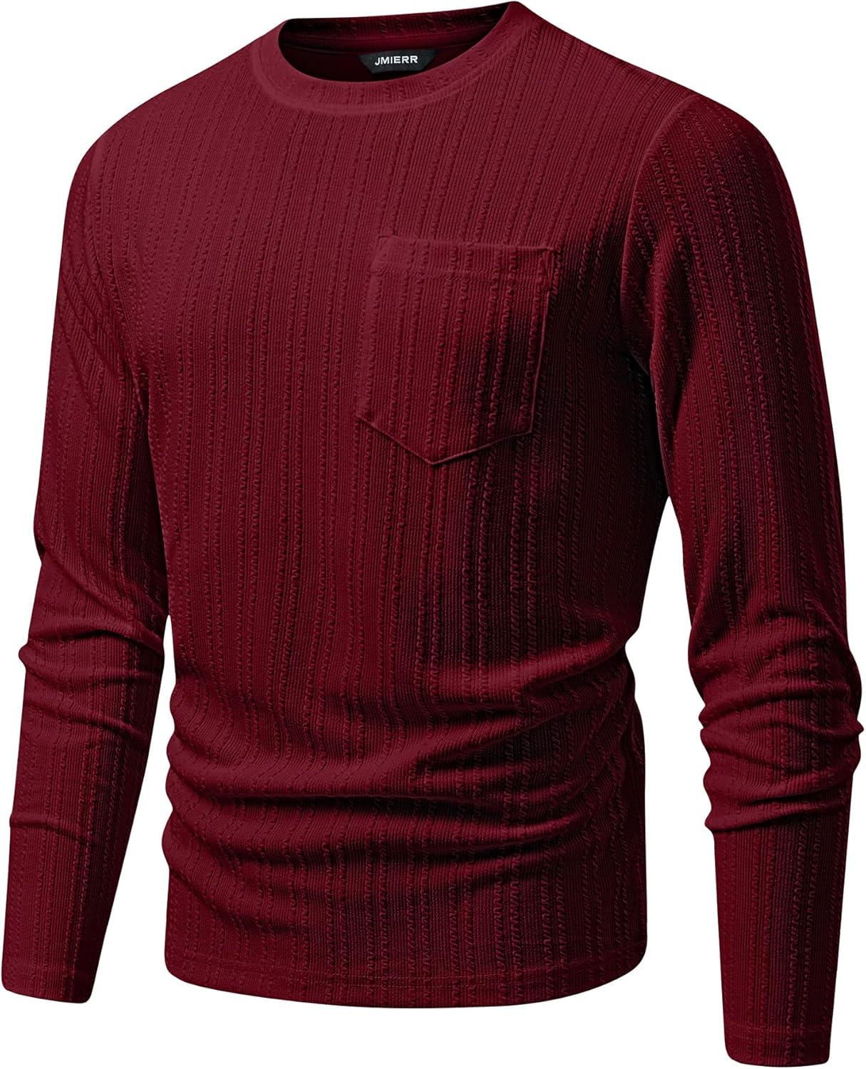 JMIERR Men’s Long Sleeve Shirts Casual Crewneck Pullover T-Shirt Stretch Textured Knit Tee with Pocket(10 Red)