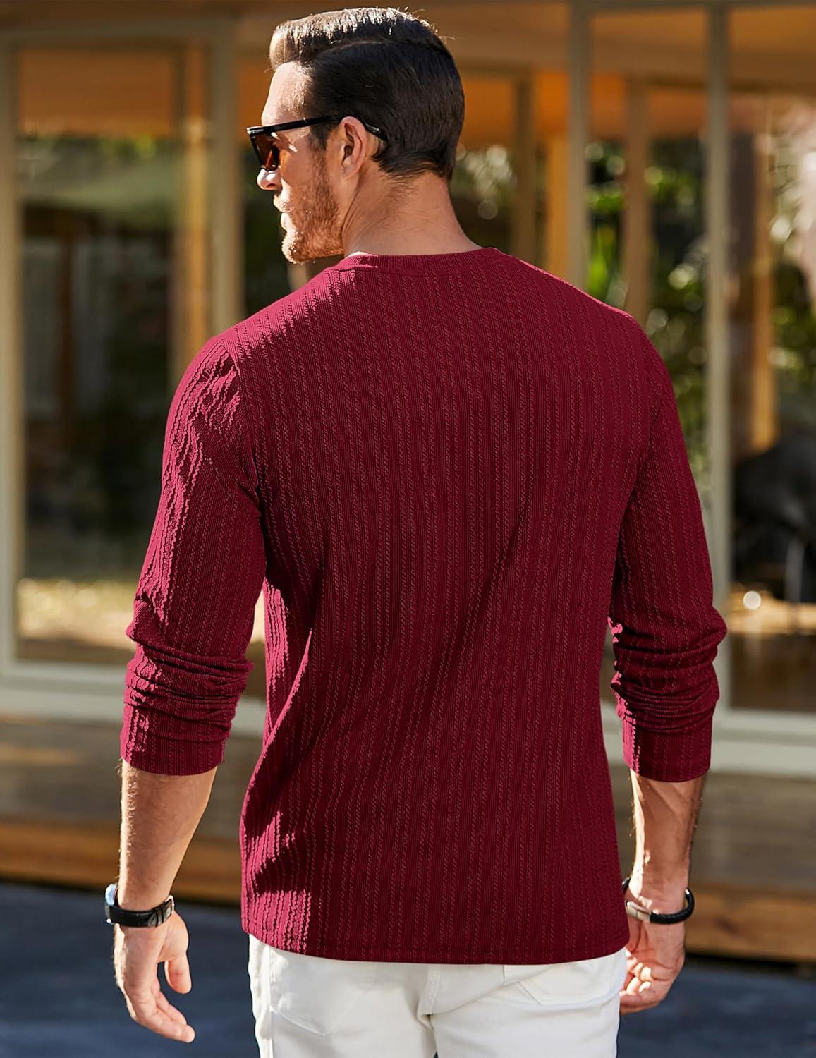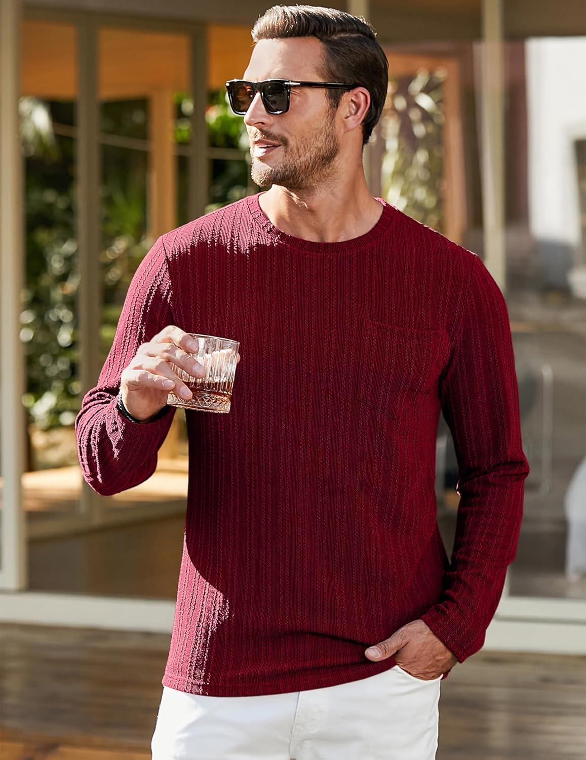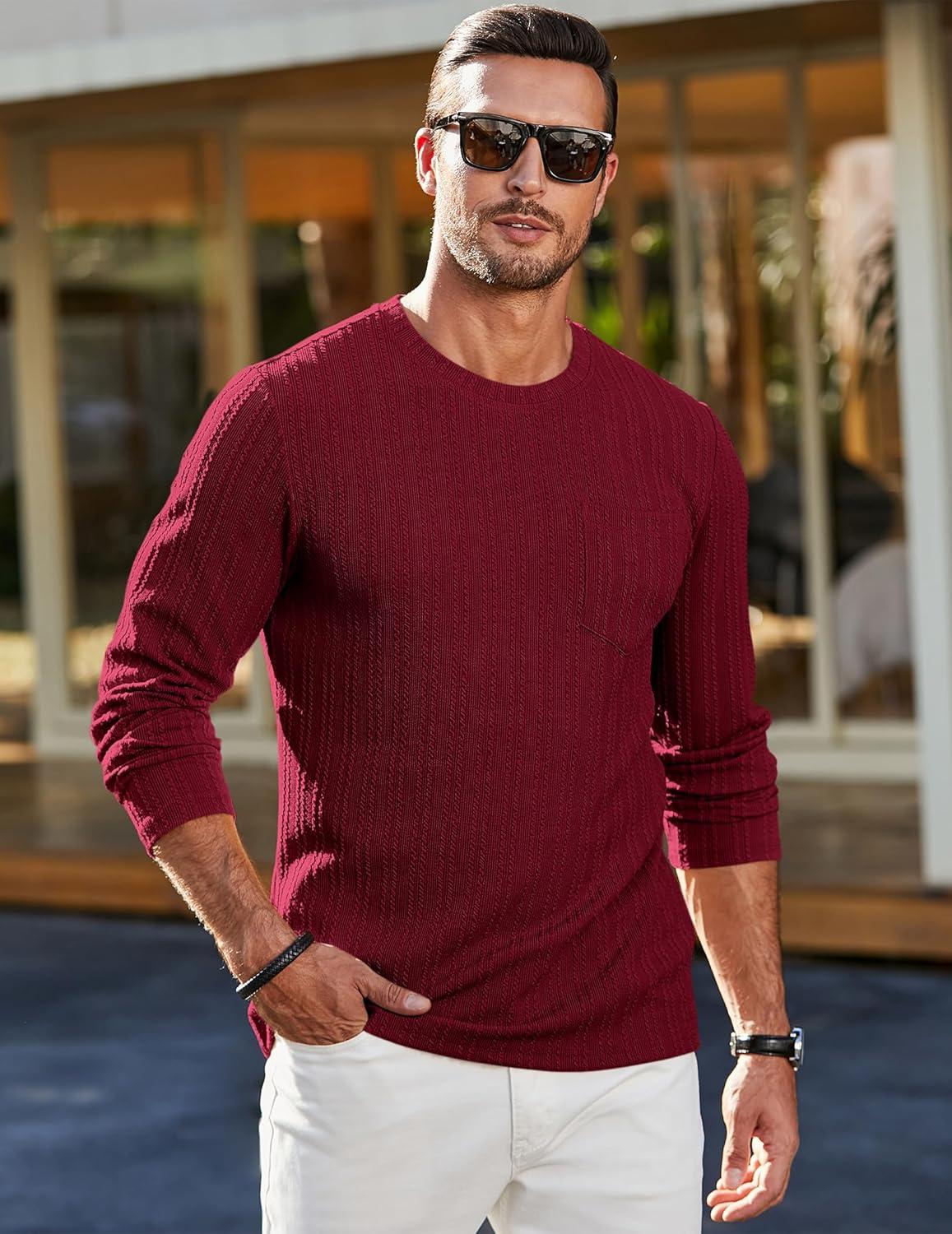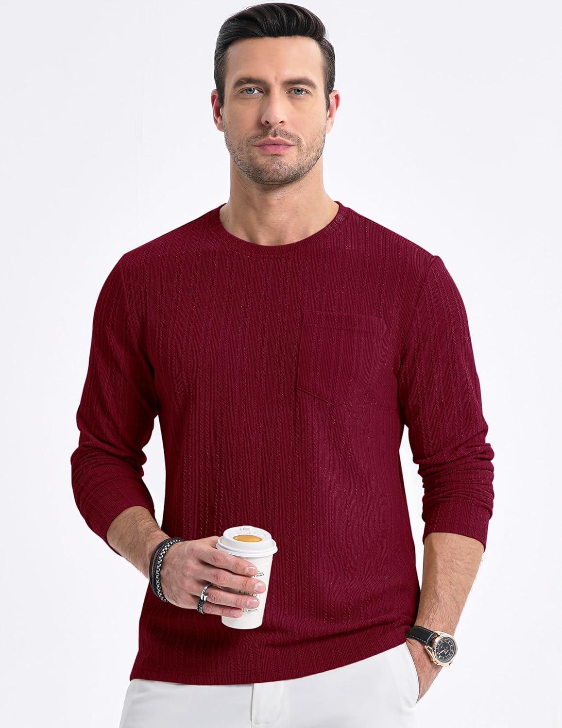 JMIERR Men’s Long Sleeve Shirts Casual Crewneck Pullover T-Shirt Stretch Textured Knit Tee with Pocket(10 Red)