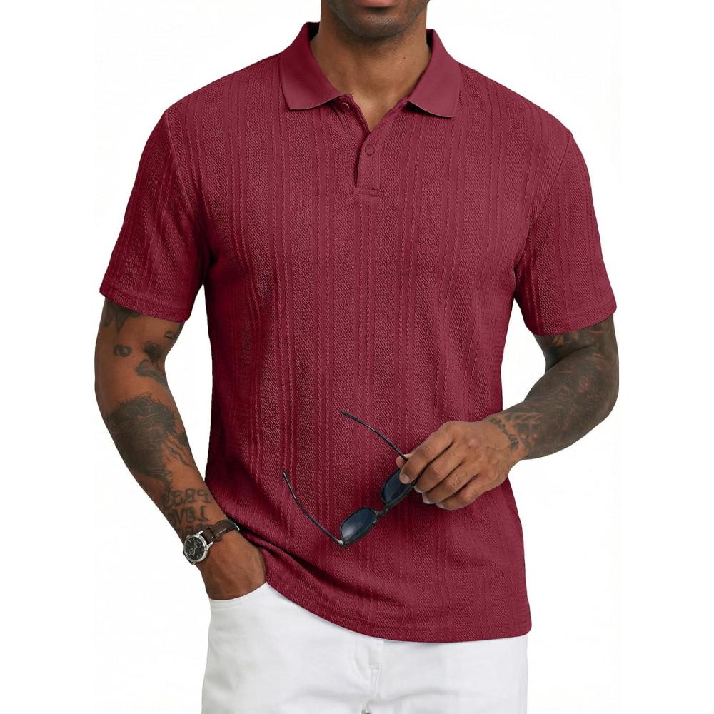 JMIERR Mens Polo Shirt Textured Short Sleeve Summer Button Collar Knitted Golf Polos(Red)