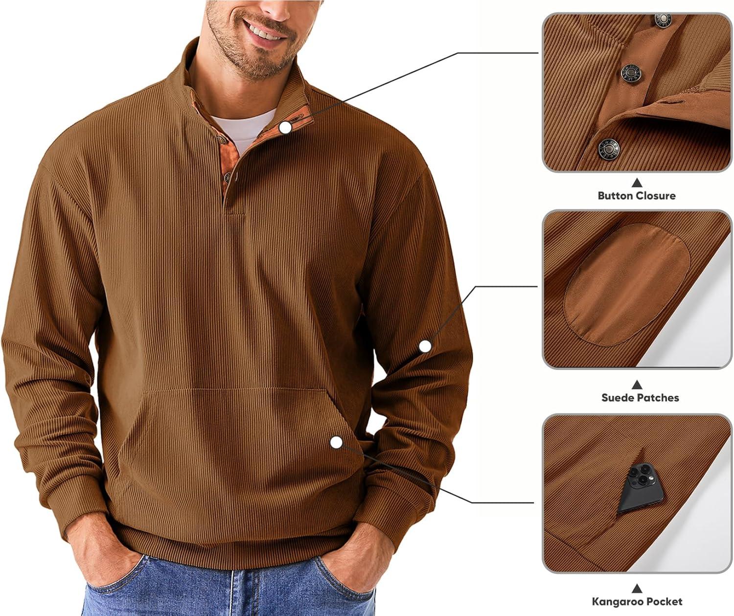 JMIERR Mens Warm Corduroy Sweatshirt Casual Stand Collar Quarter Fall Metal Button Pullover Sweaters Long Sleeve with Pockets(F Chestnut Brown)